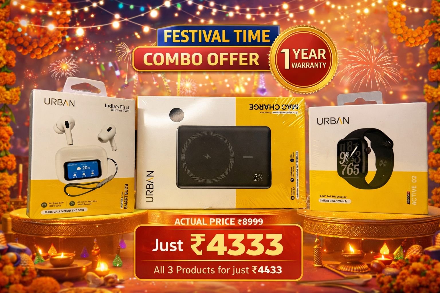 Upgrade your tech experience with the power bank earbuds, smart, watch combo. This all-in-one set includes a reliable power bank, wireless earbuds, and a sleek smart watch, making it perfect for daily use or travel. The power bank earbuds, smart, watch from Your Brand NAME Urban ensures convenience, style, and functionality in one package.